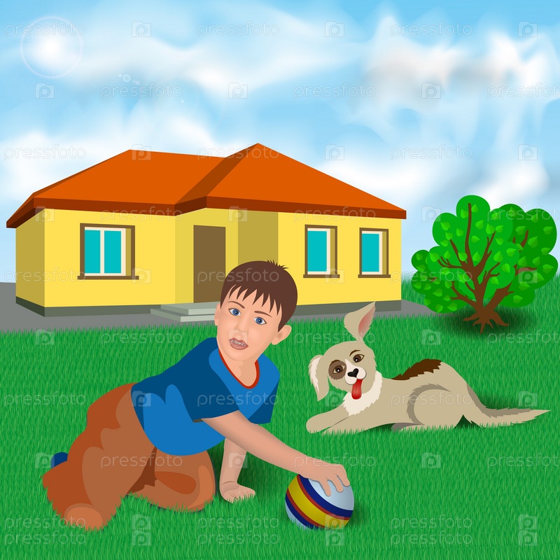 Ребенок и собака возле дома