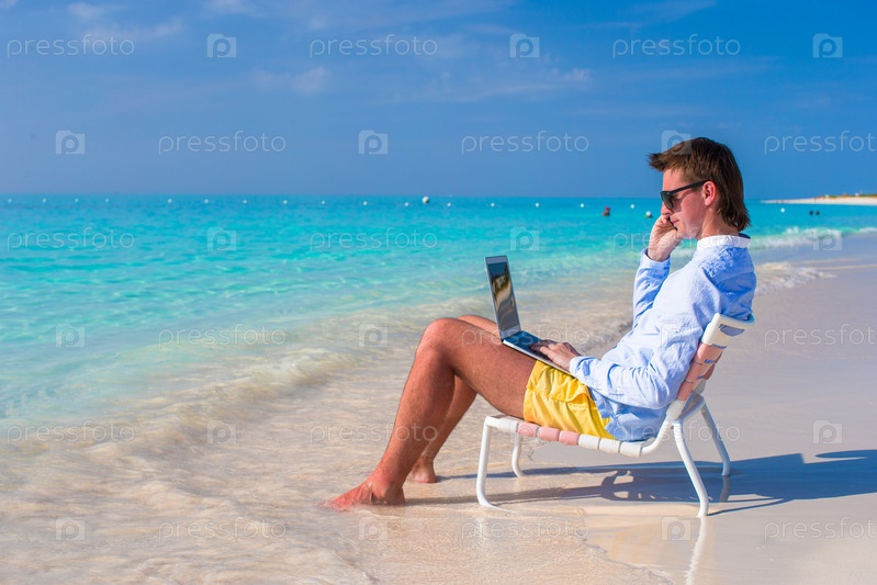 Молодой человек с ноутбуком на пляже