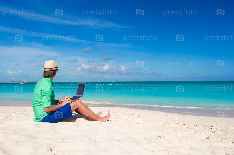 Молодой человек работает на пляже