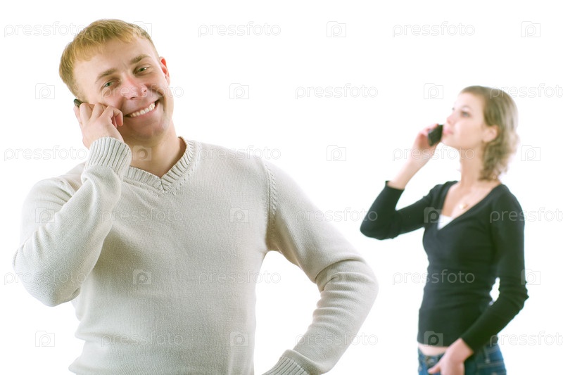 Пара разговаривает по телефону, изолированная на белом фоне