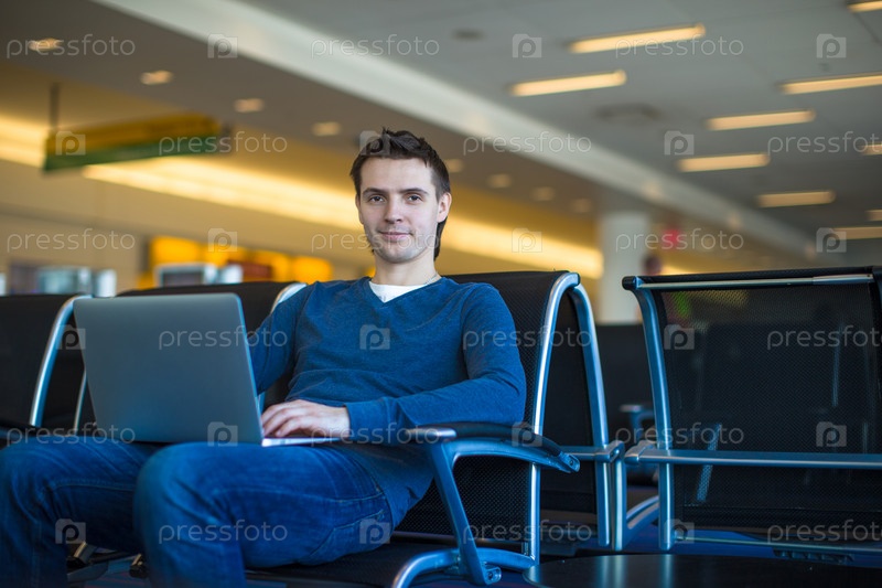Молодой человек с ноутбуком в аэропорту