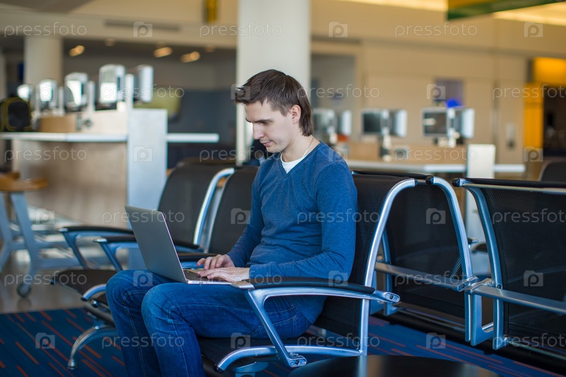 Молодой человек с ноутбуком в аэропорту