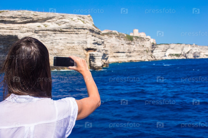 Девушка снимает прибрежные скалы