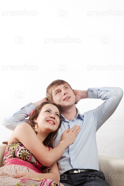 Молодая пара мечтает, сидя на диване