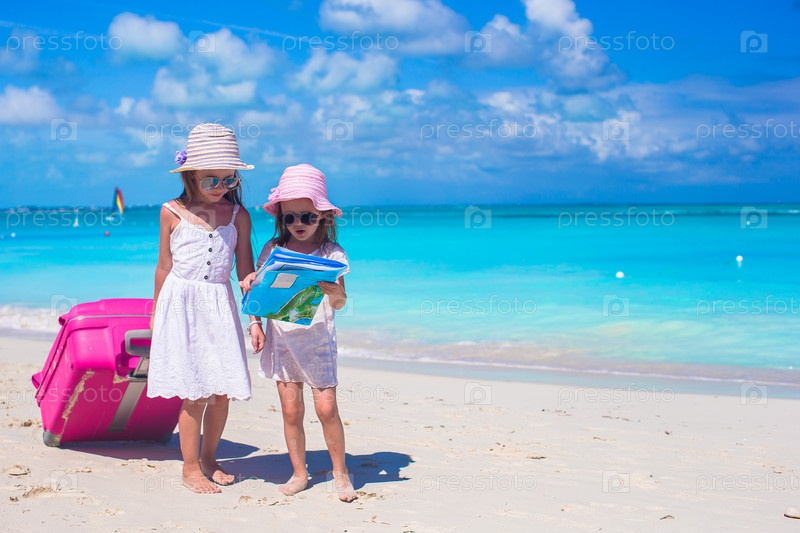 Маленькие девочки с картой на пляже