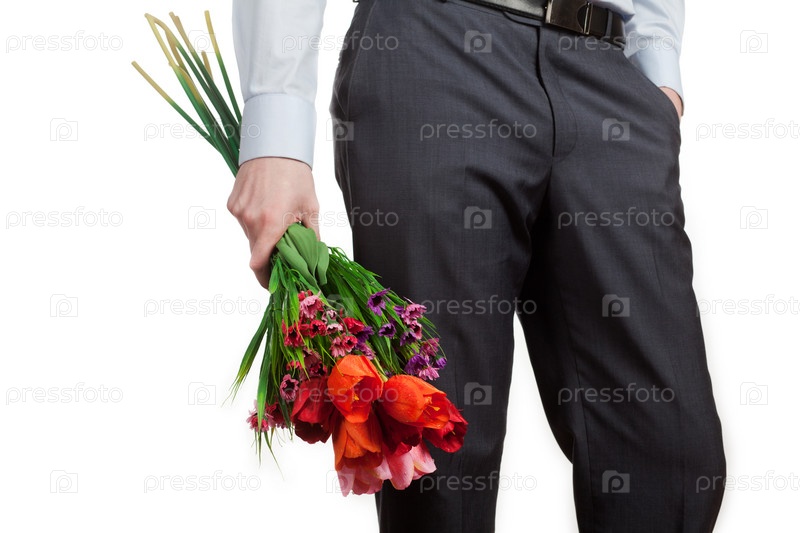 Молодой человек с букетом цветов в руке. фрагмент