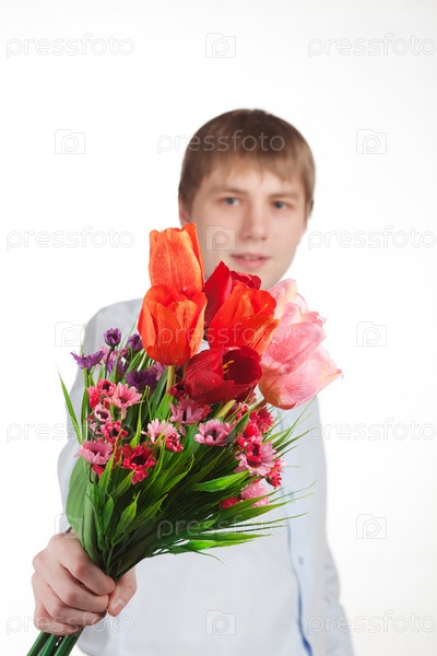 Молодой человек протягивает букет цветов