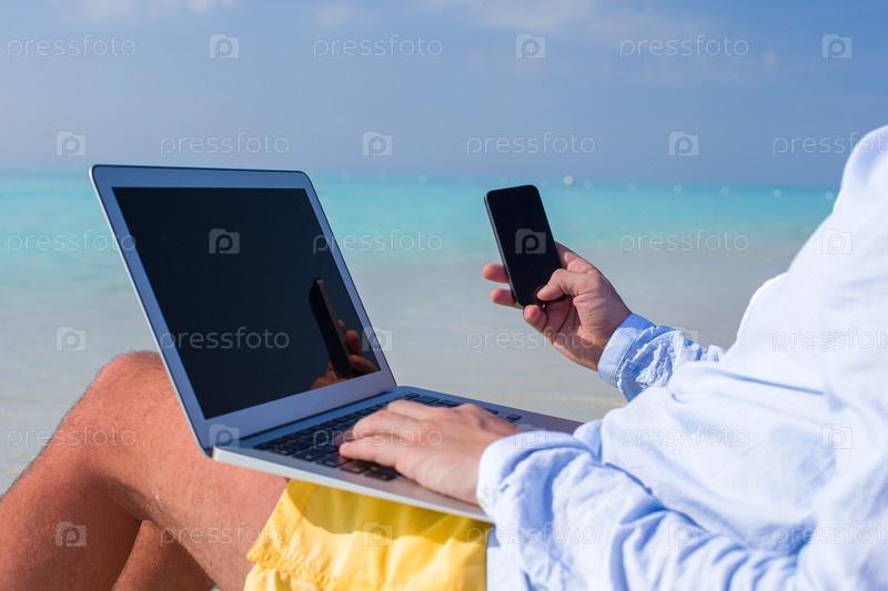 Молодой человек работает с ноутбуком на пляже