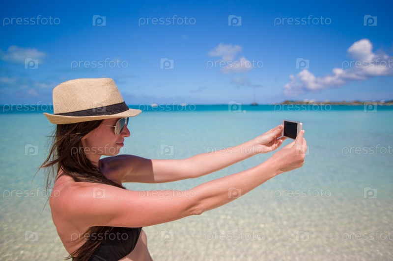 Молодая женщина со смартфоном на пляже
