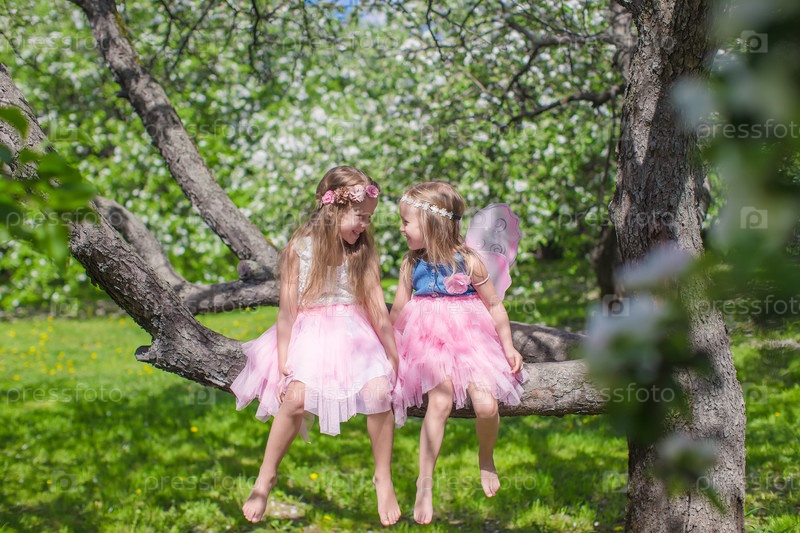 Очаровательные девочки сидят на ветке