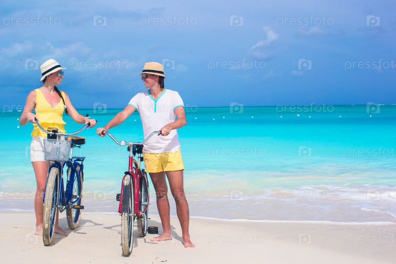 Пара с велосипедами на пляже
