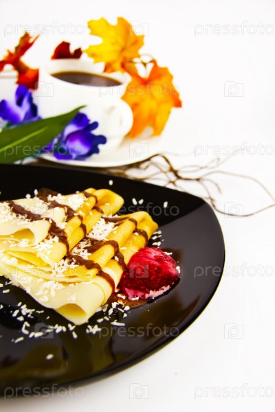 Свежие блины с малиновым вареньем, кокосом и шоколадом