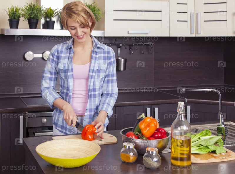 Красивая молодая женщина готовит салат