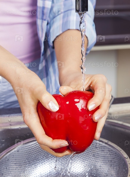 Женщина моет перец