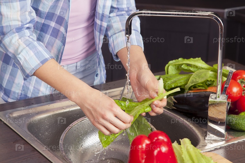 Женщина моет овощи