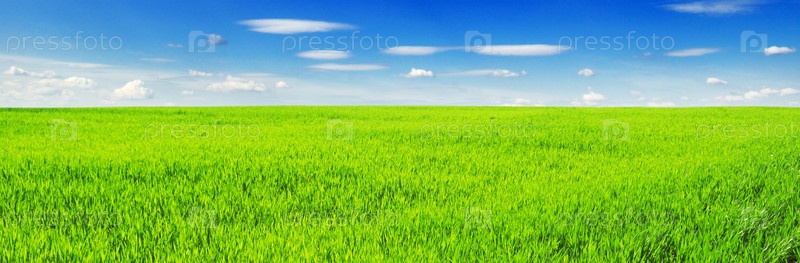 Поле с зеленой травой и голубое небо