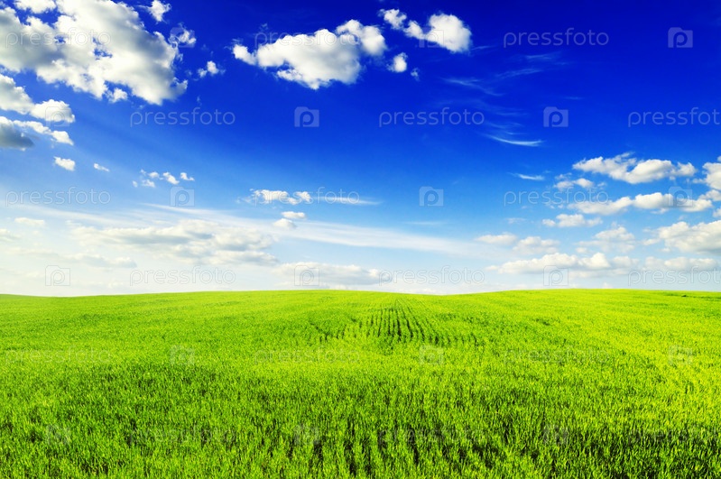 Поле с зеленой травой и голубое небо
