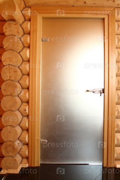 Фрагмент стены деревянного дома с дверью из калиброванного бруса