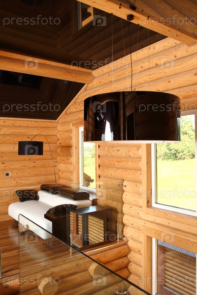 Просторная гостиная в деревянном доме, выполненная в стиле хай-тек