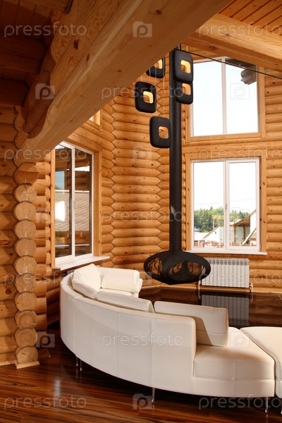 Просторный зал в деревянном доме, выполнен в стиле хай-тек