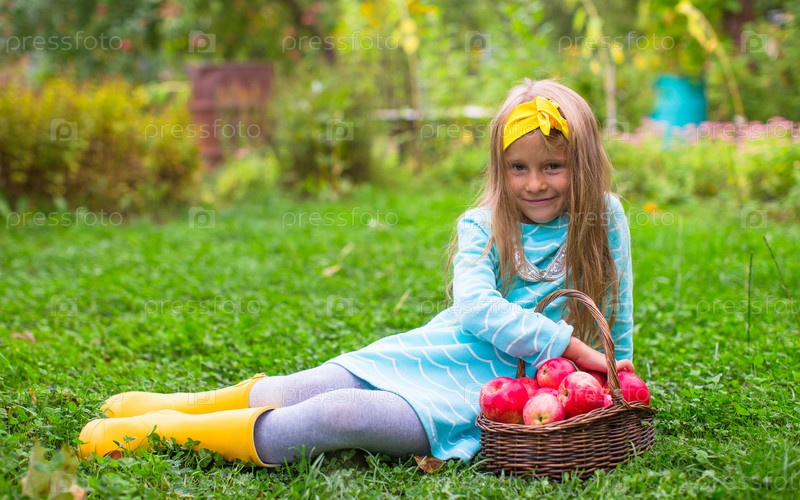 Очаровательная девочка с корзинкой осеннего урожая