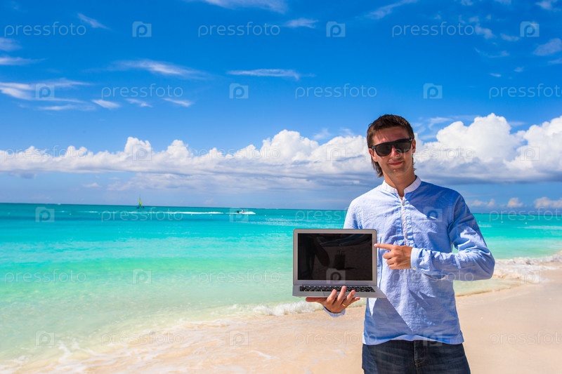 Молодой человек с ноутбуком на пляже
