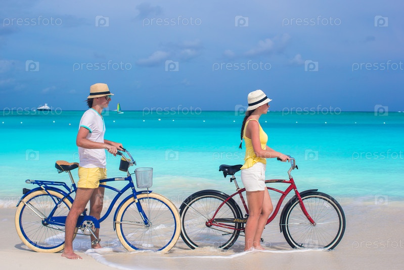 Счастливая пара с велосипедами на пляже