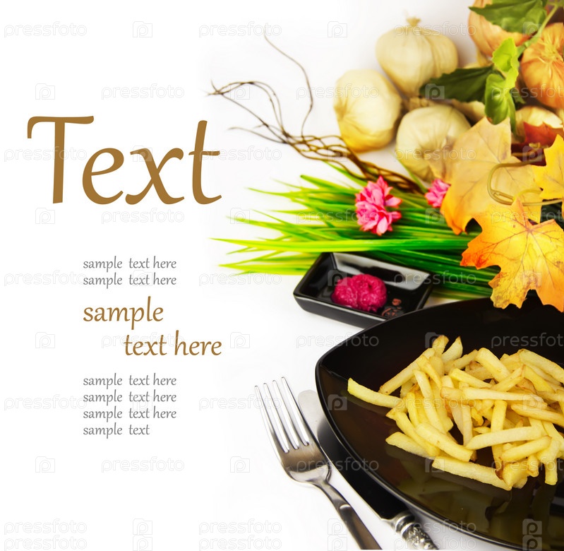 Картофель фри, специи и ингредиенты с образцом для текста