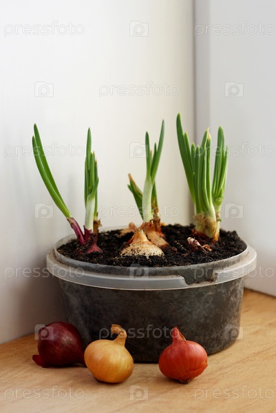 Лук растет в горшочке