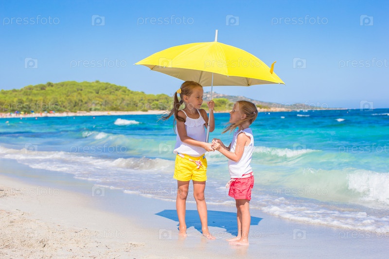 Маленькие девочки на пляже под зонтиком