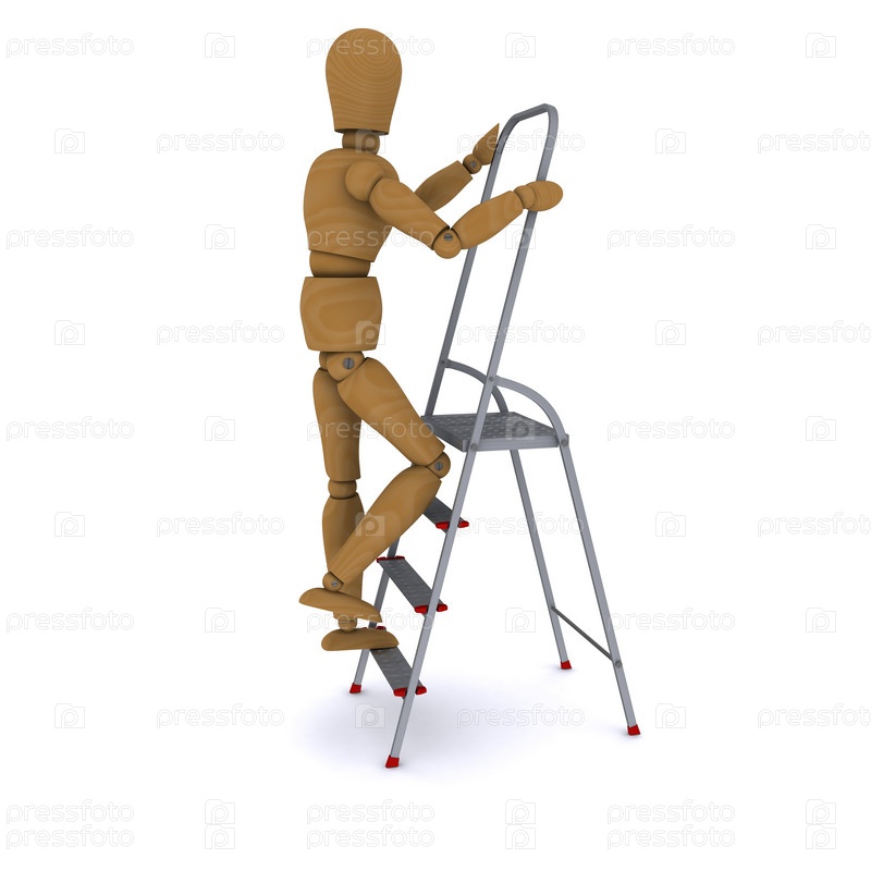 Деревянный человек поднимается по лестнице. вид со стороны. 3D-рендеринг
