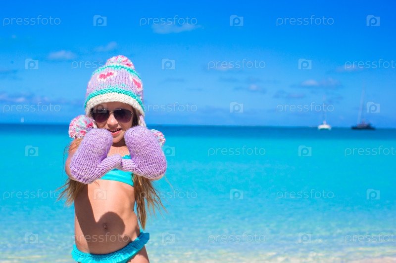 Девочка в теплой шапке на пляже