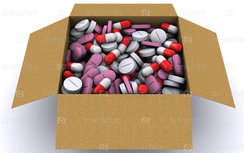 Таблетки в картонной коробке. 3D-рендеринг