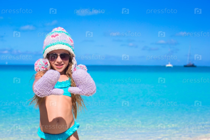 Девочка в зимней шапке и рукавицах на пляже