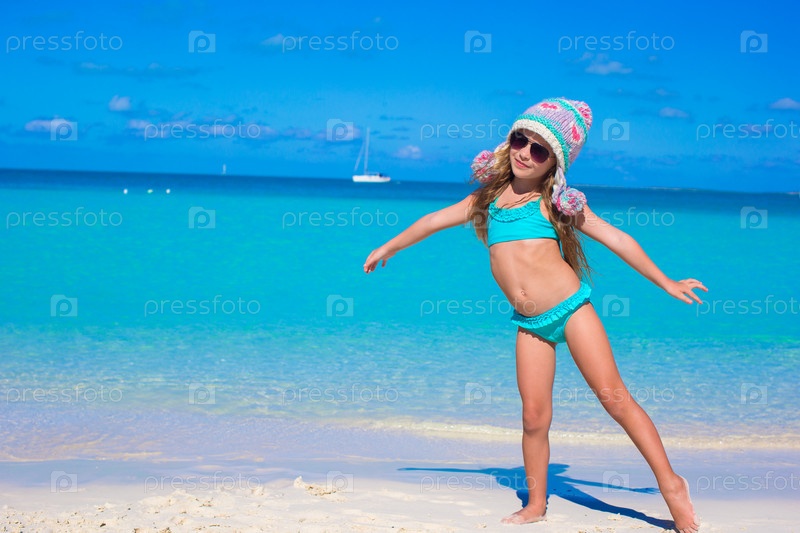 Девочка в теплой шапке на пляже