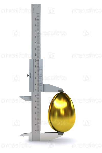 Штангенцикл измеряет золотое яйцо. 3D-рендеринг