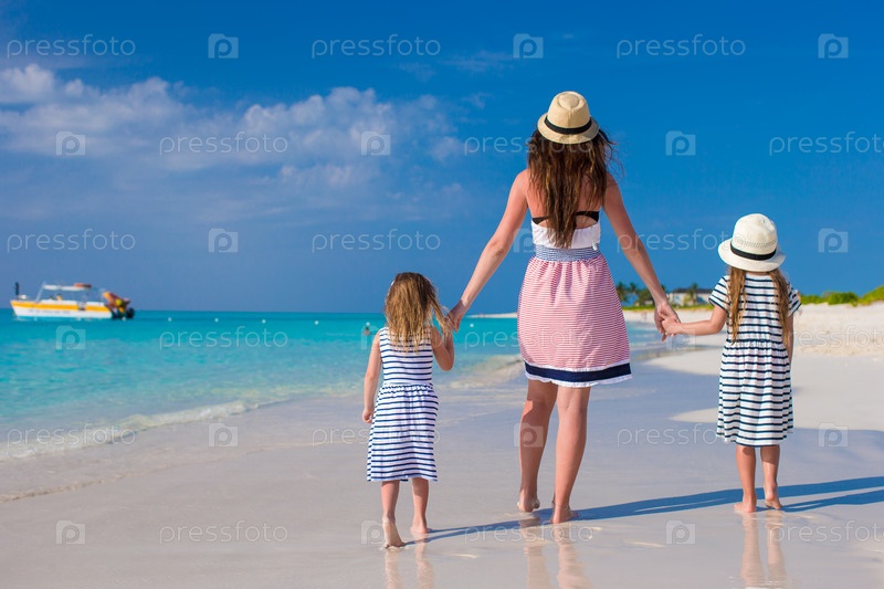 Мать с дочерьми гуляет по пляжу