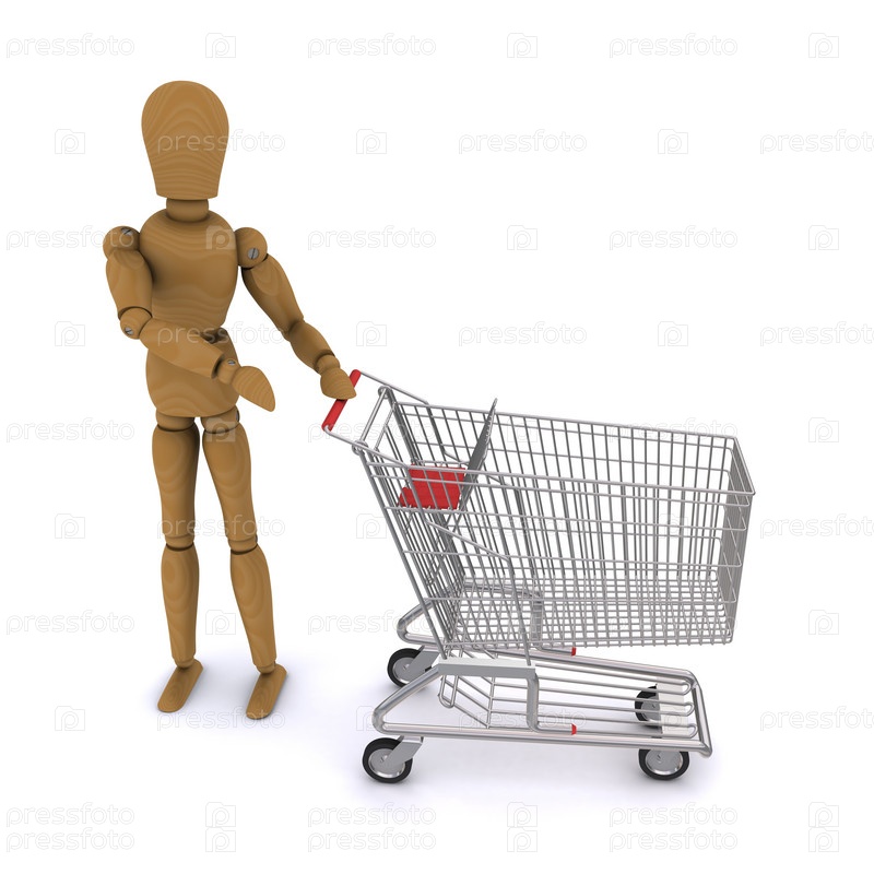 Деревянный человечек с пустой тележкой супермаркета на белом фоне