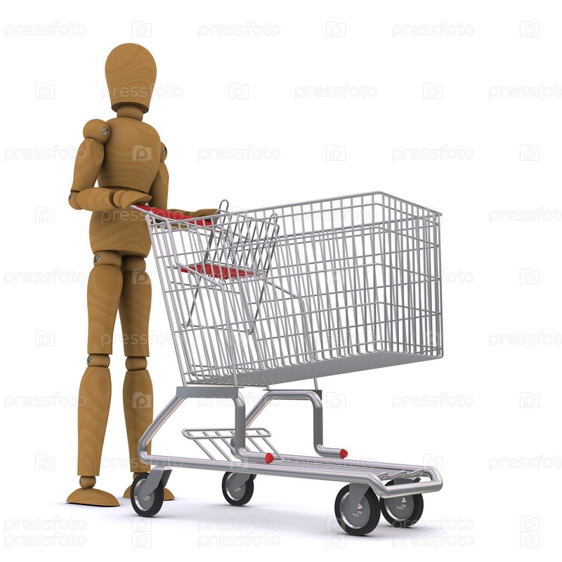 Деревянный человечек с тележкой супермаркета на белом фоне