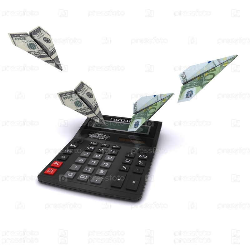 Калькулятор и самолеты из долларов и евро, концепция обмена валютой. 3D-рендеринг