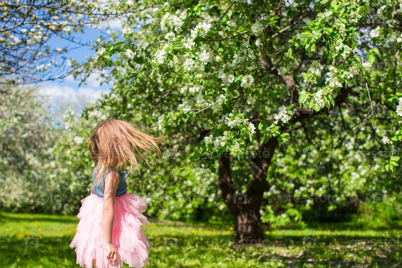 Очаровательная маленькая девочка в цветущем саду