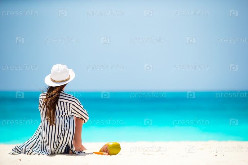 Молодая женщина на белом пляже с кокосом