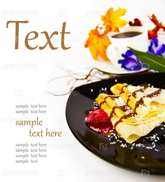 Свежие блины с малиновым вареньем, кокосом и шоколадом, шаблон