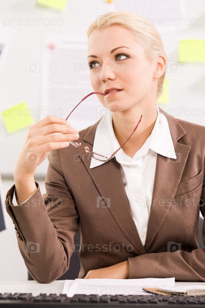 Портрет задумчивой бизнес-леди, сидящей на рабочем месте с очками в руке