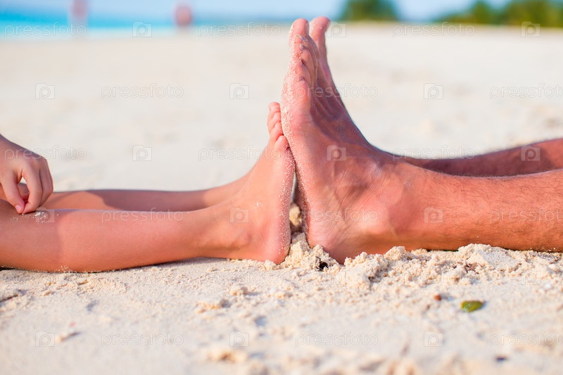 Детские и взрослые ноги на белом песчаном пляже