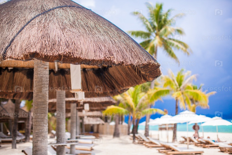 Деревянные шезлонги для отдыха на тропическом пляже