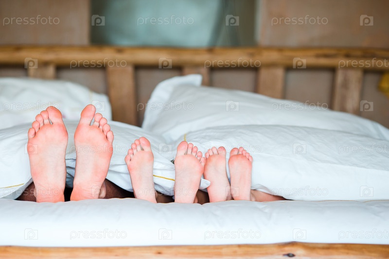 Ноги семьи в постели