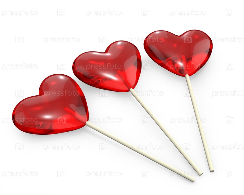 Три леденца в форме сердец, изолированные на белом фоне