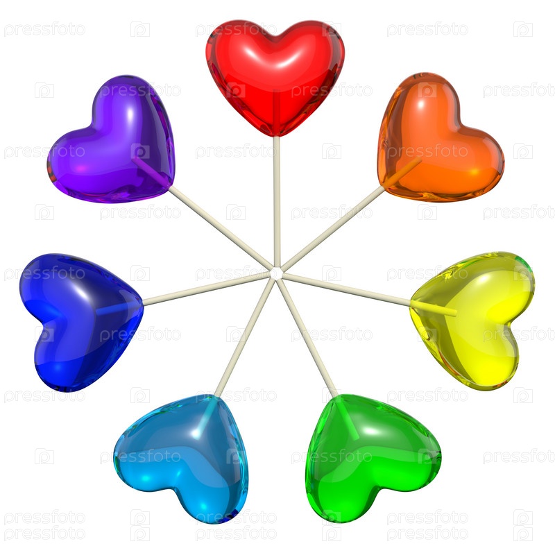Семь цветных леденцов в форме сердец, изолированные на белом фоне
