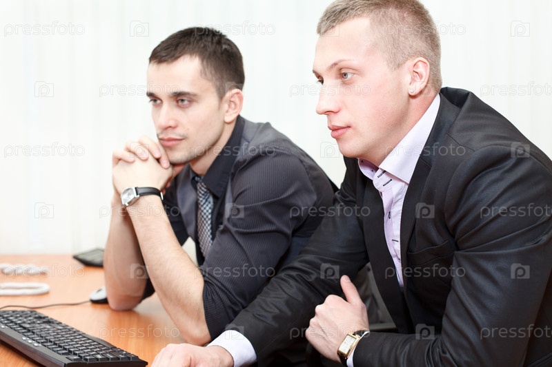 Два бизнесмена смотрят на экран компьютера в офисе
